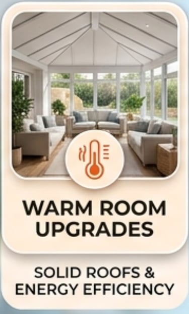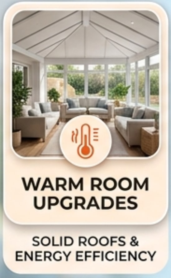 Roof Replacements & Upgrades: Swap your old glass or polycarbonate for a modern, solid roof to create a true Warm Room experience.